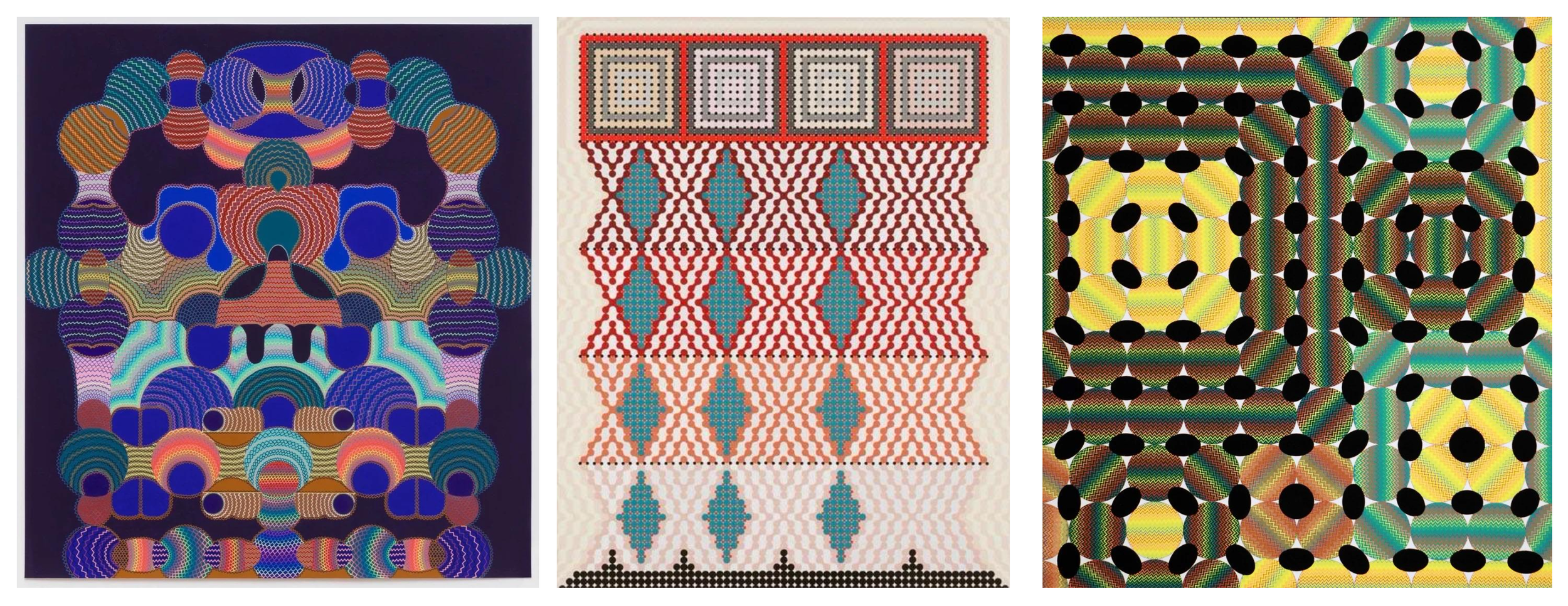 The Imagists developed a visual language that was both rigorous and exuberant: densely layered patterns, hand-built geometries, and color relationships that seem to pulse with energy. Their work balanced discipline with play, embracing repetition, micro-detail, and a deliberately handmade sensibility that resisted polish in favor of personality.