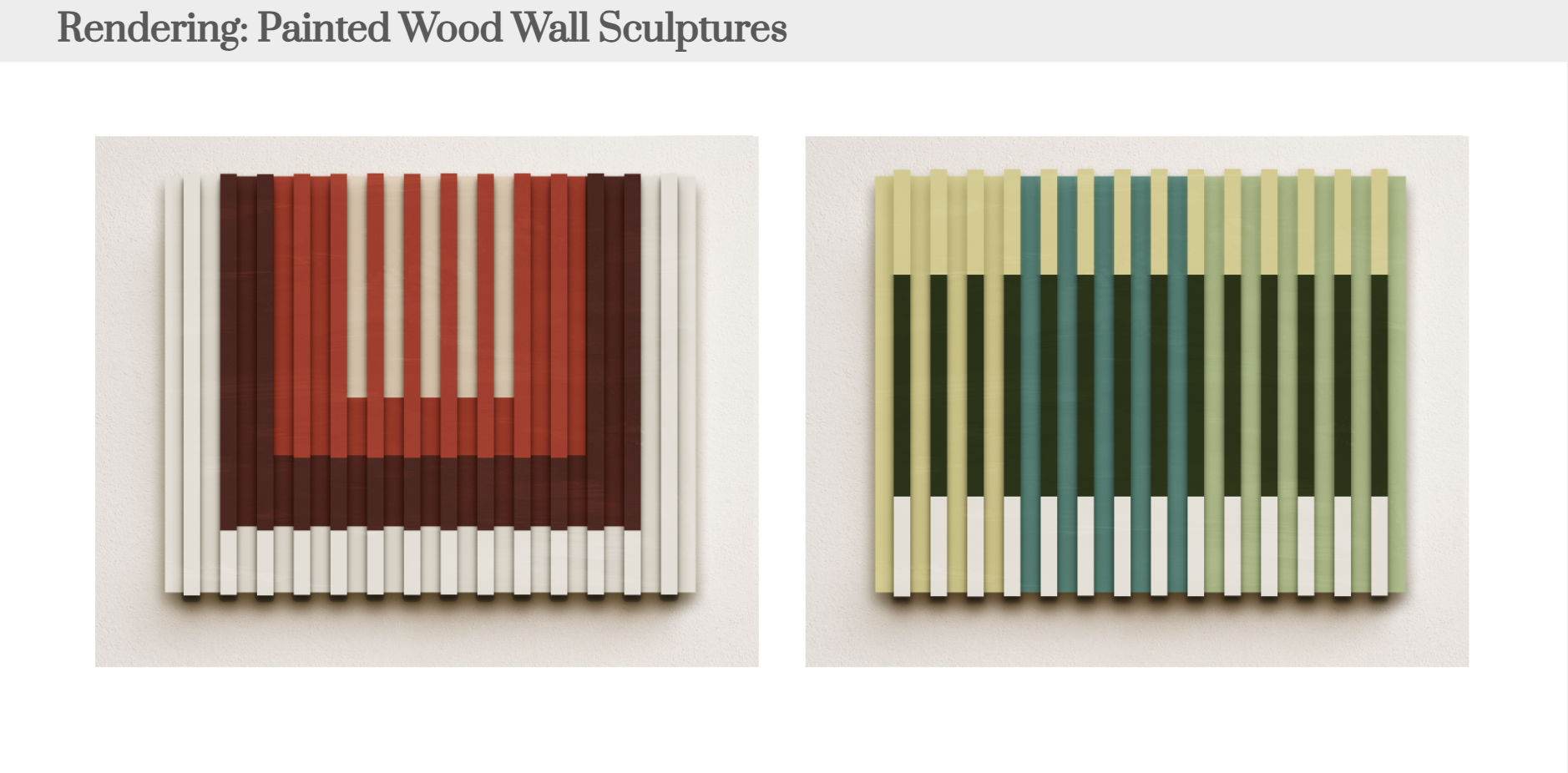 Each room features a pair of wood relief sculptures composed of hand-painted, vertically arranged dowels. These pieces draw from the core principles of the Imagists: repetition, pattern, and the power of the handmade. Subtle shifts in color create a quiet optical vibration, echoing the movement’s fascination with visual rhythm and intensity.
