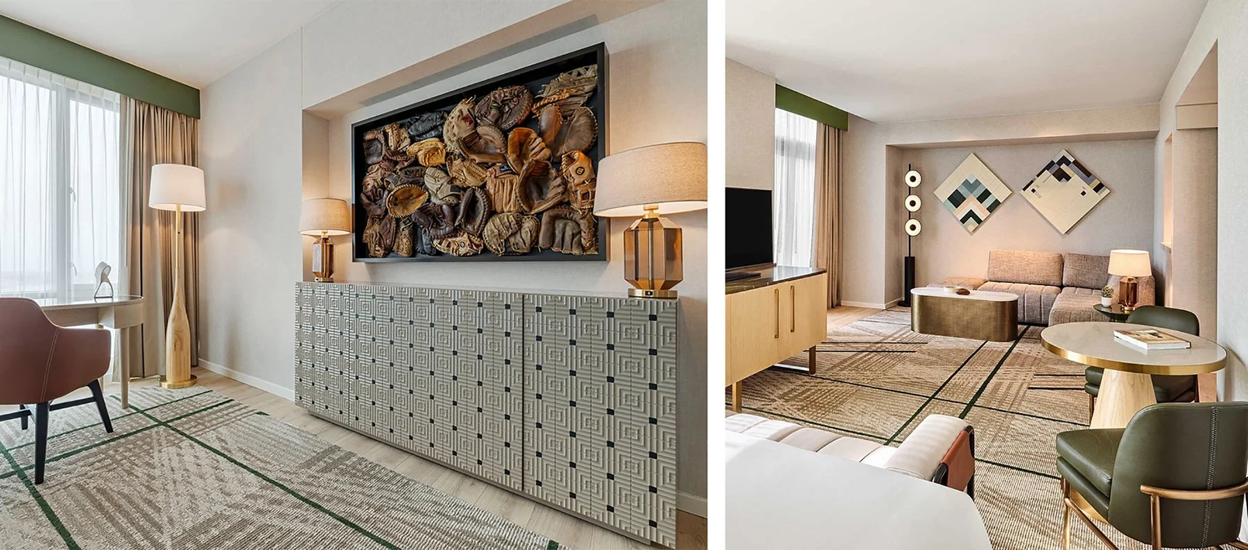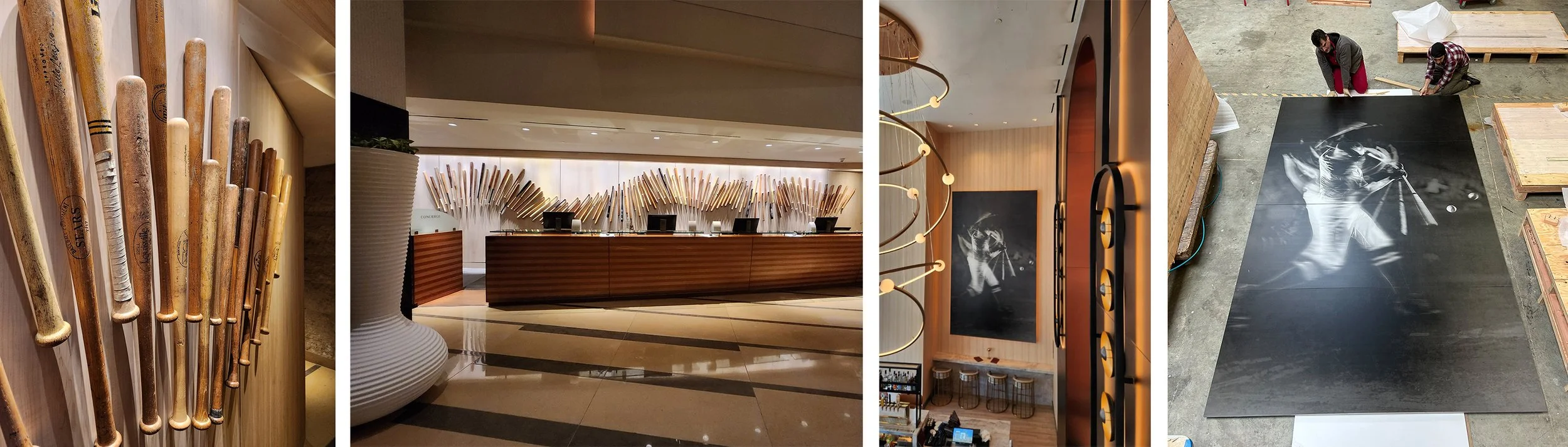 There are hotels near ballparks, and then there's the Omni San Diego at the Ballpark. It sits steps from Petco Park, its guests are often there because of the Padres, and on game day the energy of the ballpark moves through the building. The art had to reflect that without becoming a souvenir shop. Behind the reception desk, a wall of vintage wood bats - objects with real history, real wear - establishes the identity immediately. Large-scale photographs of players in motion carry it through the property. The collection doesn't decorate the hotel's relationship to baseball. Done right, it’s not just a gesture toward baseball, It feels like the real thing.