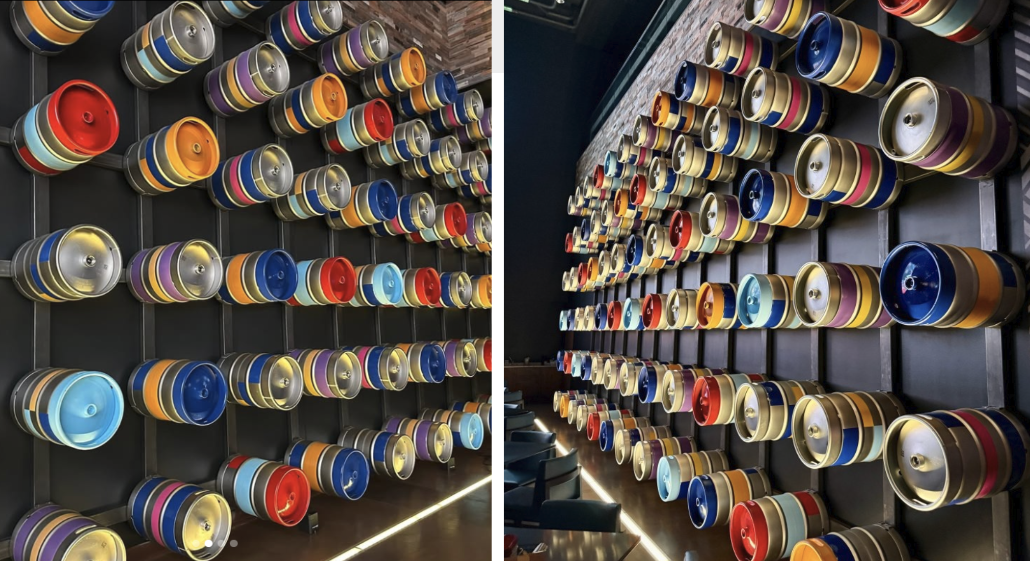 The sports bar at the Gaylord Pacific Resort: 78 authentic stainless steel kegs, hand-painted in the team colors of every San Diego franchise — the Padres, the Gulls, SDSU, SD Loyal, the Legion, the Wave — mounted across an entire wall, roughly 32 feet wide and 14 feet tall. The colors work collectively, a grid that reads as the full texture of a sports city.