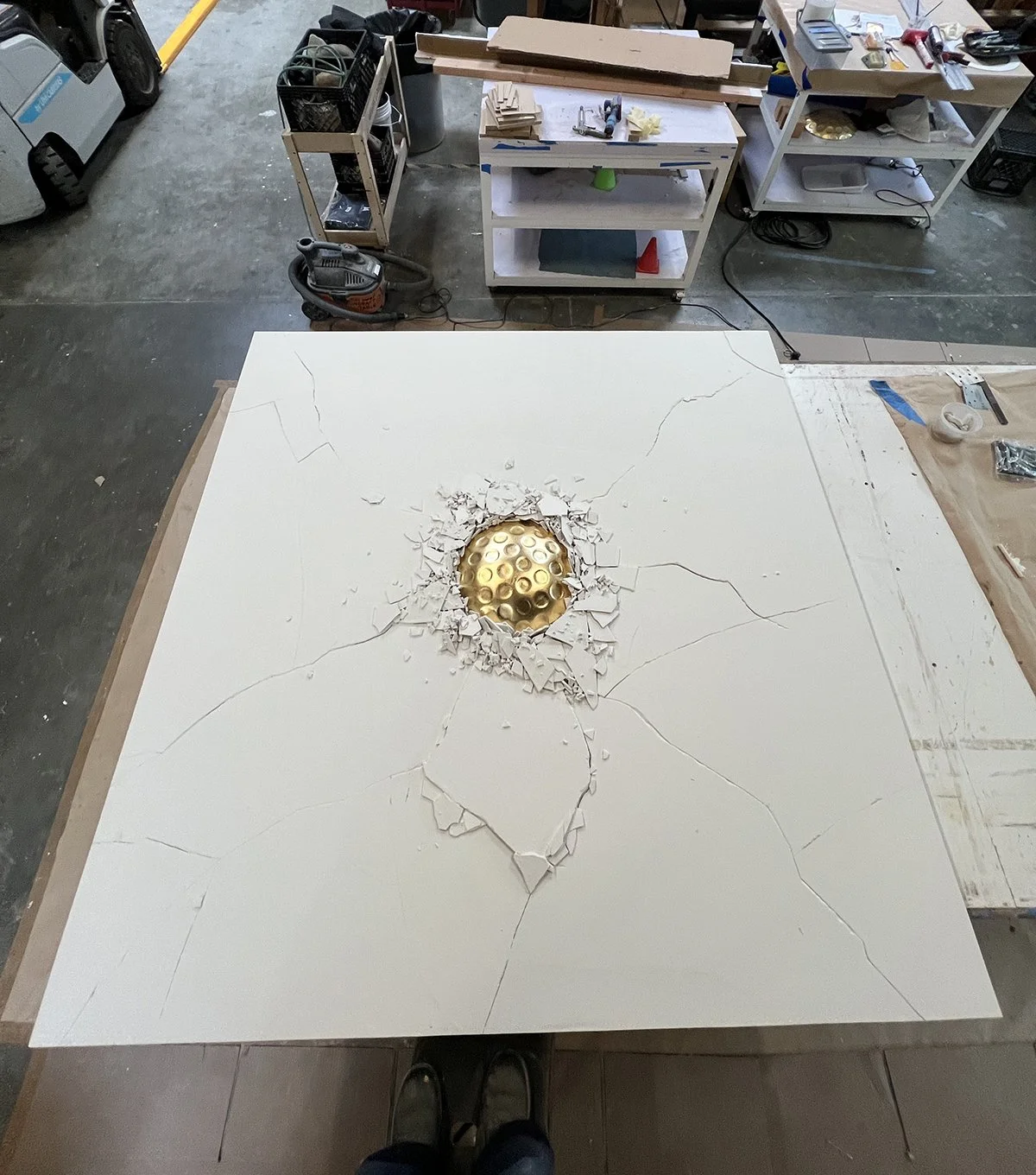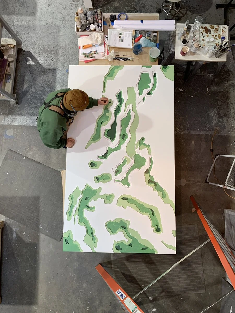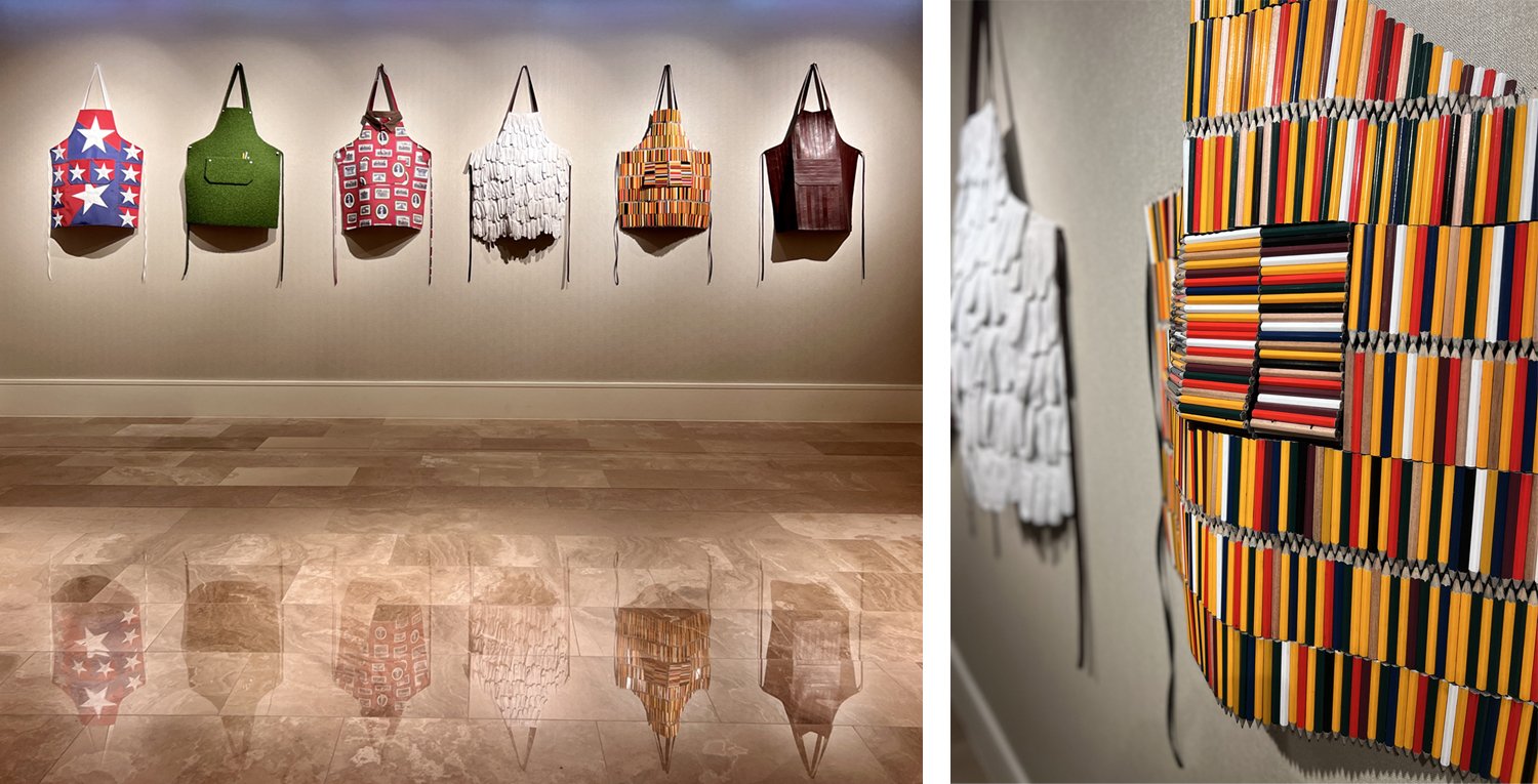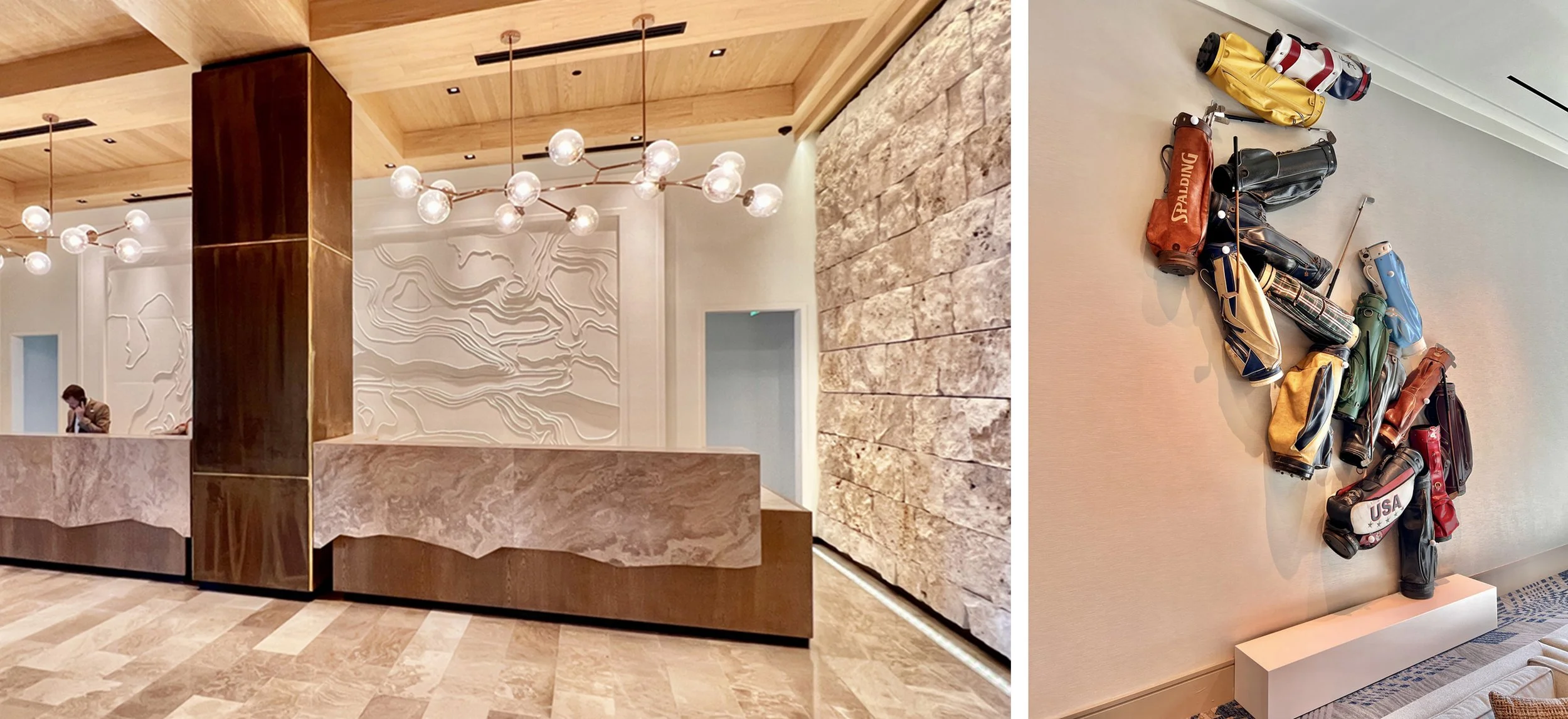 Golf presents a different challenge. The sport is inseparable from its terrain, its history, and in the case of the Omni PGA Frisco, its geography. Texas produced Ben Hogan, Byron Nelson, Lee Trevino. That lineage deserved more than framed photographs of fairways. So we built a floor-to-ceiling sculpture from vintage golf bags, carved topographic reliefs of legendary courses, and made an installation of “Aprons”, created with AstroTurf, golf gloves, pencils, leather golf club handles, the working materials of the sport rendered as art objects. The collection is specific to Texas, to the game's history there, to the particular culture of a place that takes its golfers seriously.