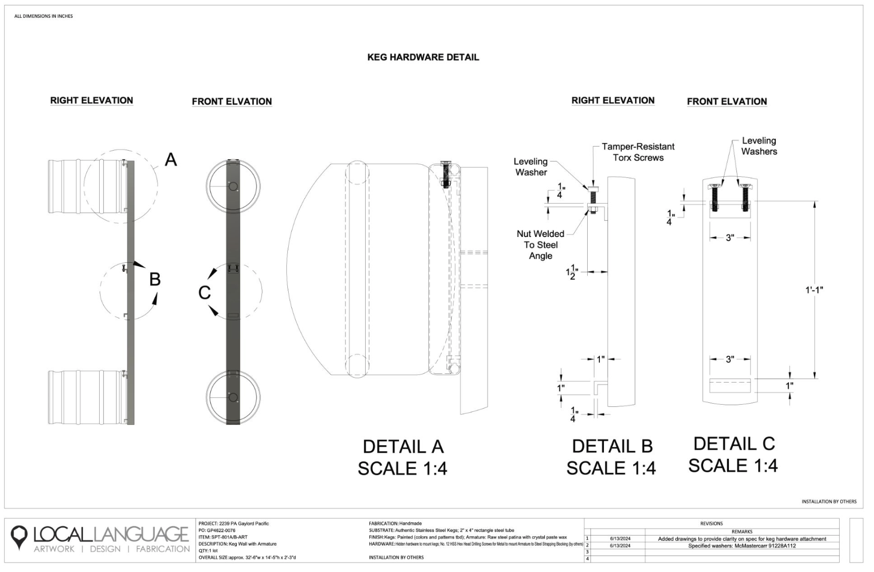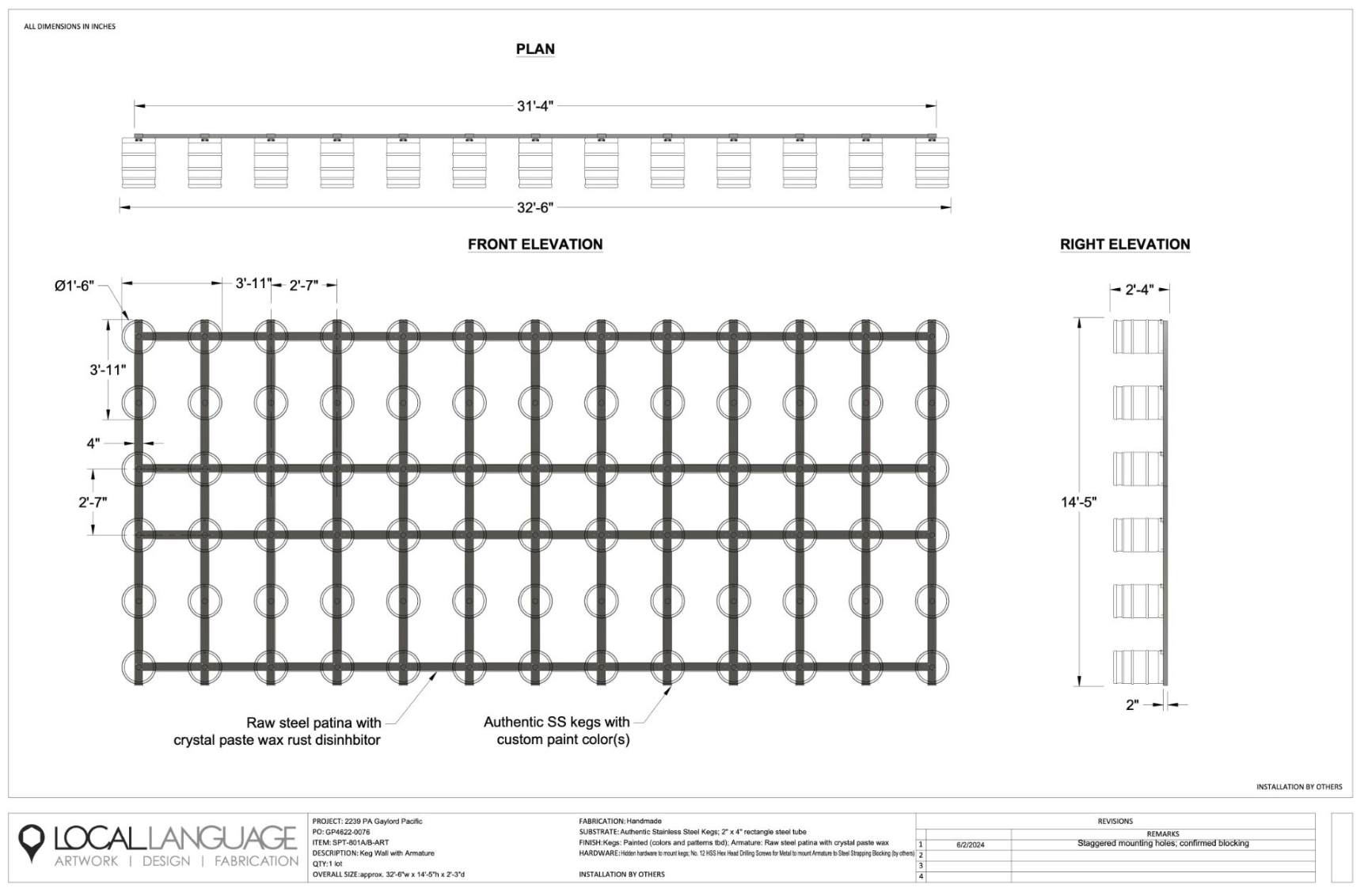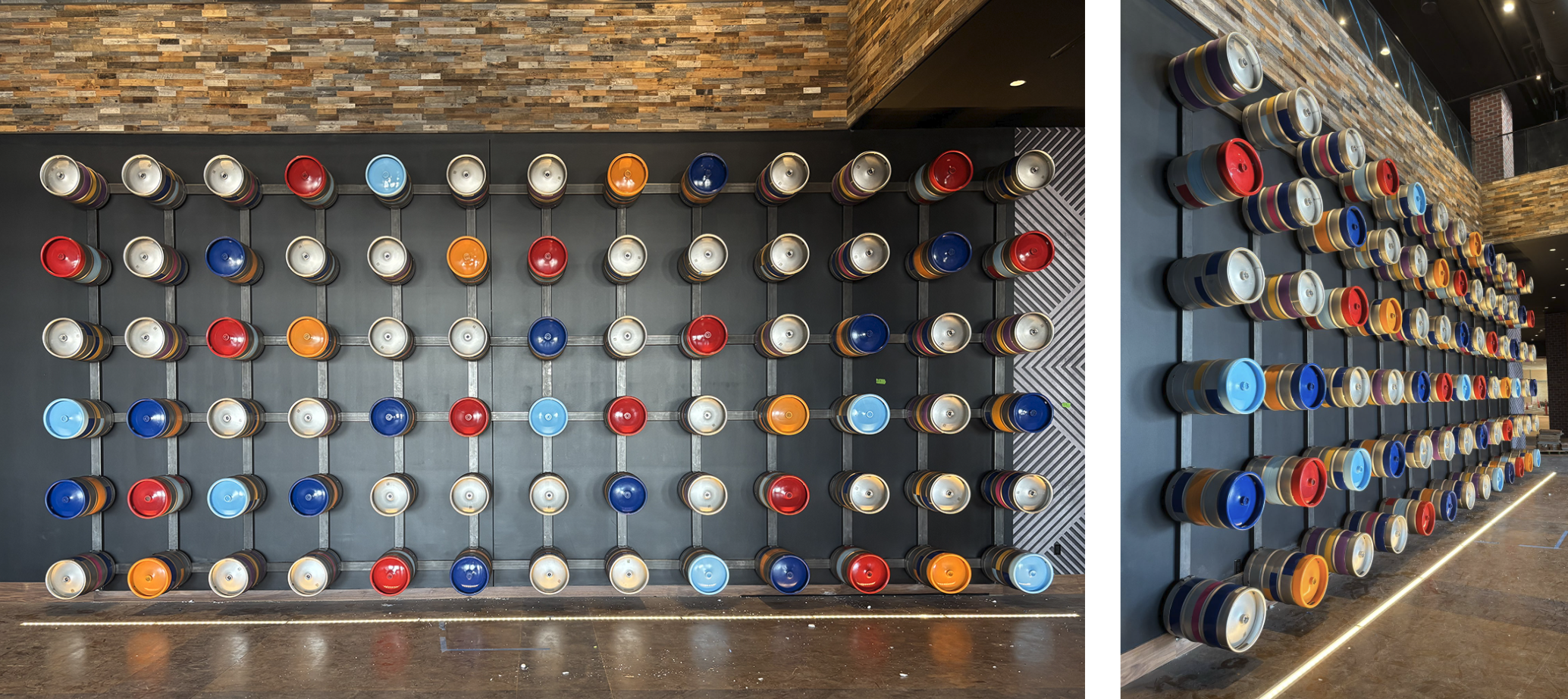 Getting there was a feat of engineering and installation coordination with every keg on hidden hardware. Kegs are heavy. The custom armature and hidden mounting hardware had to be engineered to carry that load invisibly. The result looks inevitable, which is usually the sign that nothing about making it was.